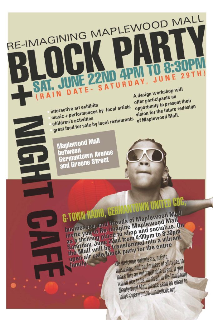 The mission of Germantown United Community Development Corporation (GUCDC) is to promote and facilitate the revitalization of the business corridors in the Germantown neighborhood of Northwest Philadelphia through a sustainable, creative, and community-driven approach to economic development. Learn more at http://germantownunitedcdc.org.
