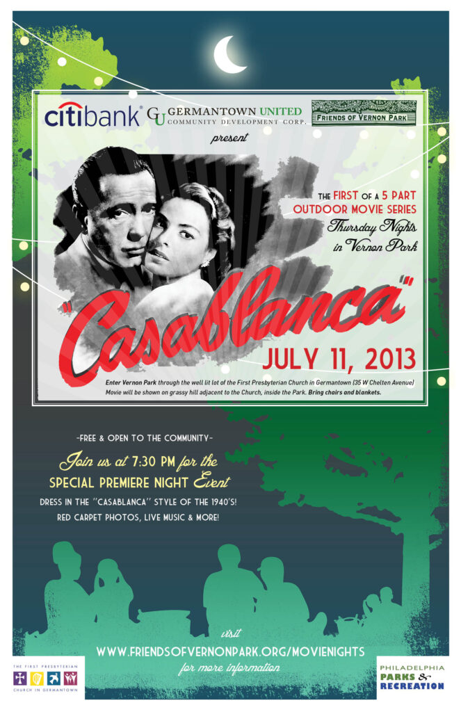 We are going all out this year! We will have live music, 1940s inspired dress and a red carpet in Vernon Park. Bring your own chairs, blanket, favorite movie snacks as we watch this classic under the stars.