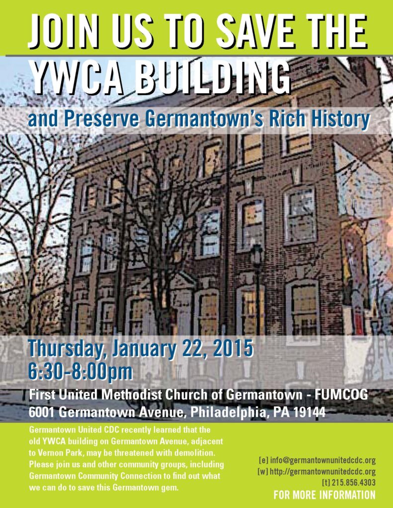 Germantown United CDC (“GU”) recently learned that the old YWCA building on Germantown Avenue, adjacent to Vernon Park, may be threatened with demolition.