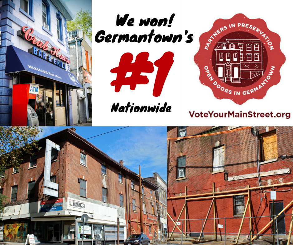 The Open Doors in Germantown project, led by the Germantown United Community Development Corporation, finished in first place out of 25 main street districts in a nationwide popular voting competition from September 25 through October 31, and earned a $150,000 grant for historic preservation. Germantown also won an additional $10,000 grant for increasing its vote total by the highest percentage during a one-week voting challenge.