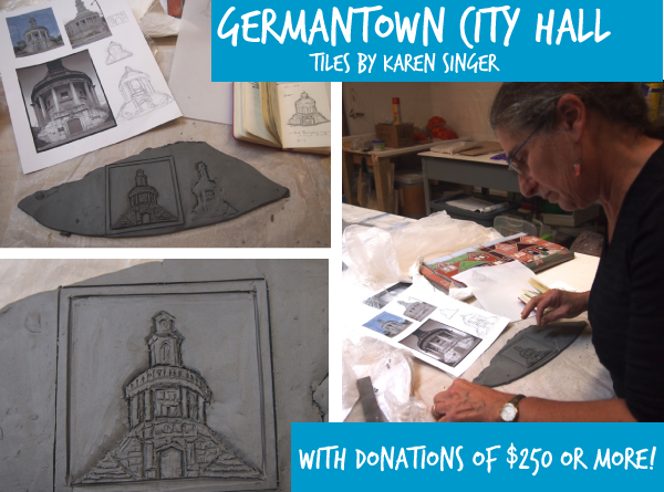 We also have an exciting reason for you to donate now! Karen Singer, one of our Merchants’ Fund grantees, has generously offered to provide beautiful handmade tiles featuring Germantown’s City Hall to donors of $250 or more throughout our campaign.  And, if you’ve already donated, please consider upping your total gift to receive this one-of-a-kind Germantown keepsake. Thank you, Karen!