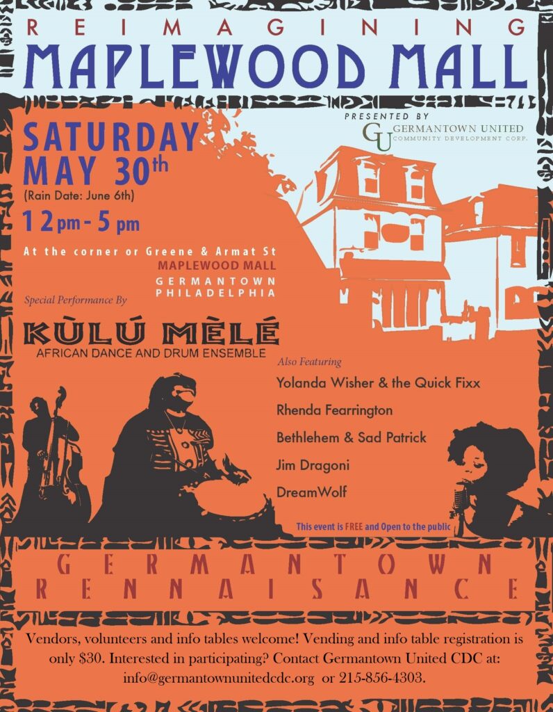 Building on the immense successes of the last three Re-imagining Maplewood Mall Festivals, Germantown United CDC is working with community stakeholders and local businesses to host this year’s Festival. Last year’s event drew hundreds of local residents, showcasing local talent and providing free family-friendly activities. The year’s event theme, “Germantown Renaissance”, is an opportunity to re-imagine Germantown, and Maplewood Mall, as an epicenter for creativity, music, food, literature, poetry and art.