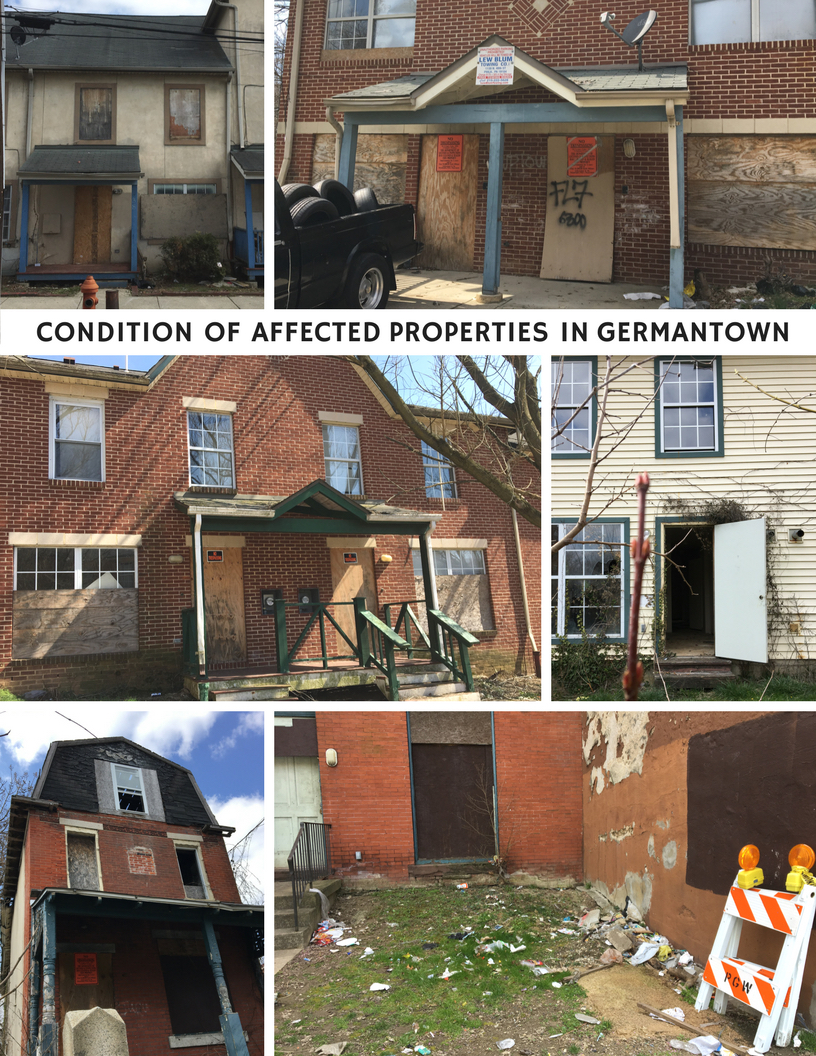 The declining condition of the 50+ properties affected by these loans has blighted the neighborhood for years, with lower Germantown absorbing the worst due to the concentration of abandoned and deteriorating housing conditions. Now, most of the units are vacant. Others are in disrepair. Some are occupied with tenants facing an uncertain future. Most of the vacant properties are unsealed, dangerous and the site of illegal activity and dumping.